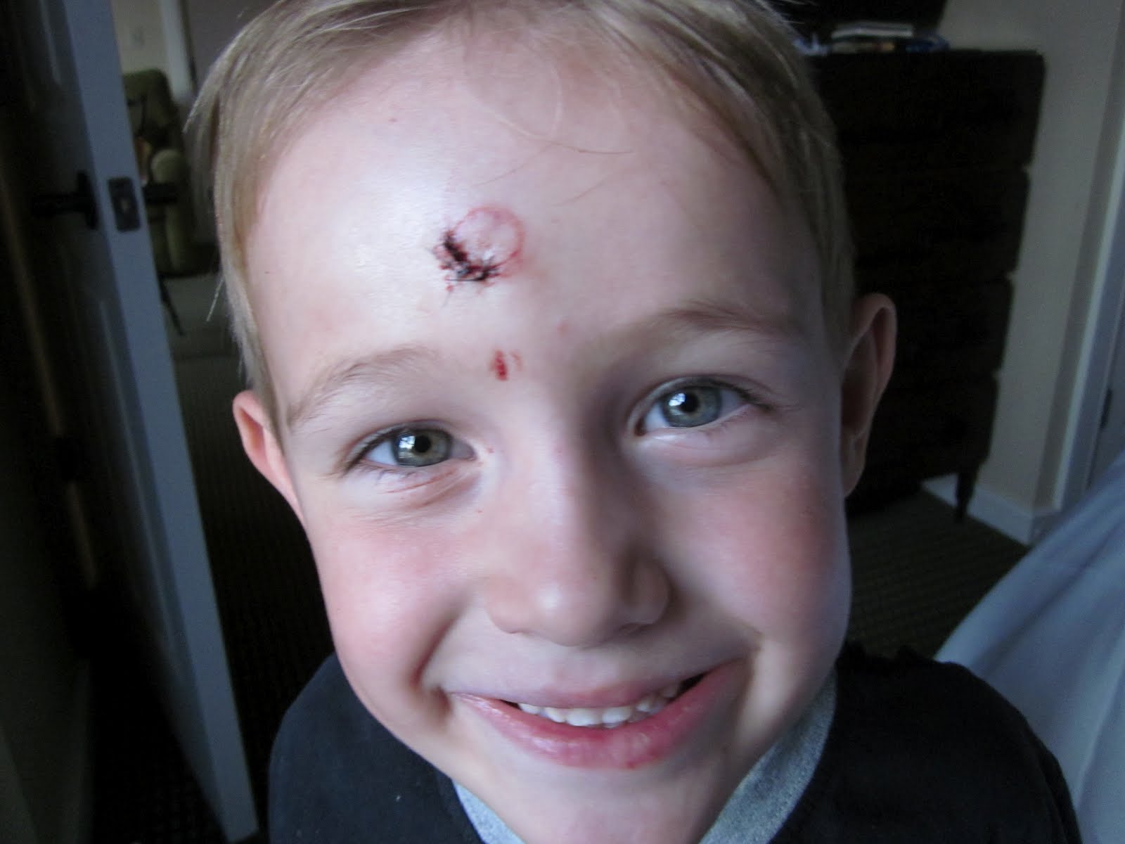 ...he throws it all up. Another perfect throw up, even better than a trash bin, he throws up in the garbage disposal side of the kitchen sick, sweet! No messy clean up! Of course, boys being boys, Eth and Joe want to see what it looks like. Gross.