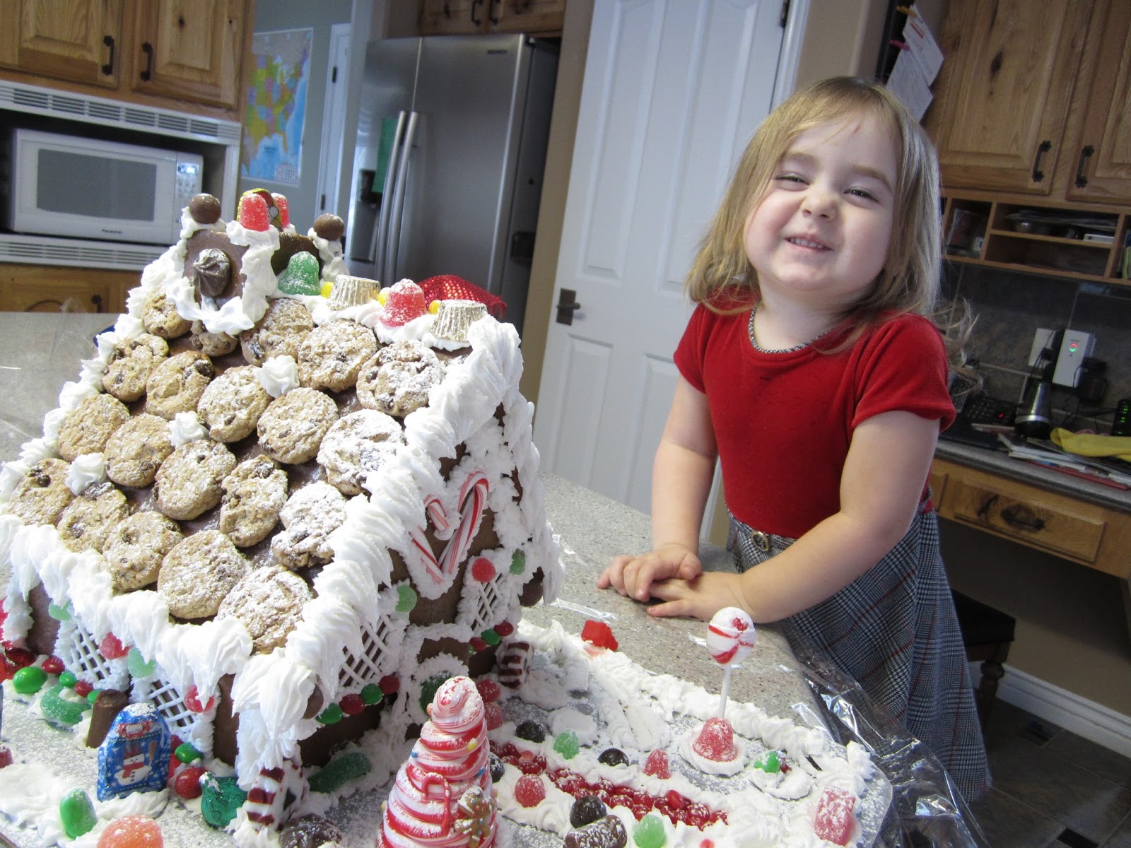 On Saturday morning a neighbor called to see if we were home. She also asked me if I knew anyone who makes fresh gingerbread. "No,,," I replied, a little puzzled by her question. Then she asked if she could come by. I guess I should have/could have put two and two together, but I didn't, cause a few minutes later she came by and totally surprised us by giving us a big candy house! What a treat! She said she just likes the idea of there being a candy house in a home with lots of children, (and her question about making gingerbread was just to test if this was something I already did) so lucky for us! It was made with fresh gingerbread she made herself! (nice smile Natalie)