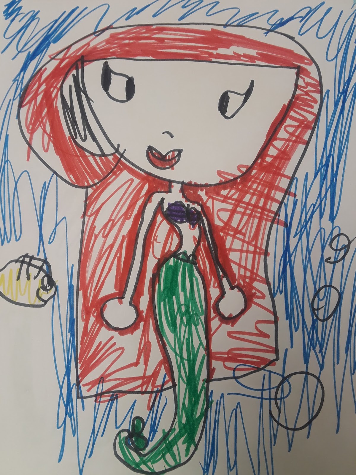 Here is one by Natalie. She's learned how to do the eyes from watching Sophi draw... This is someone from the Lego Elves movie, Emily Jones I think?