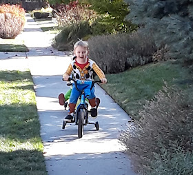 Owen laughed that Daniel was chasing him, and Daniel was laughing too. It was super cute. Last year Daniel was able to drive the wiggle car and his legs were a perfect length, but now he's getting bigger and his legs are just slightly longer, so it makes his toes scrape after he pushes off. So I was glad when he rode with his feet up -