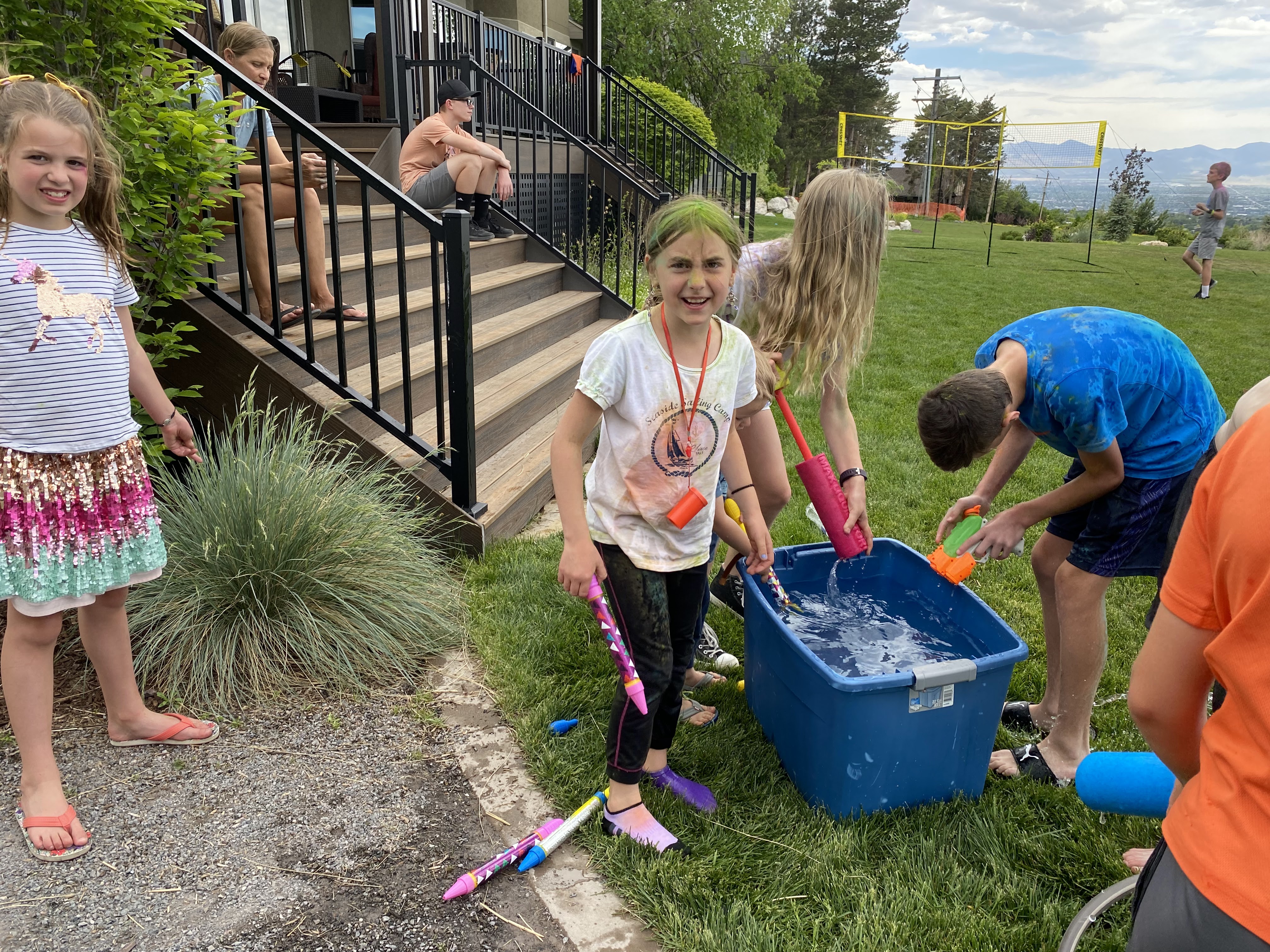 At 2:00 after school, there was ice cream and a color party at our neighbor's house. The kids threw colored chalk in the air, like last year. Sophi and Natalie had green chalk in their hair and over their clothes -