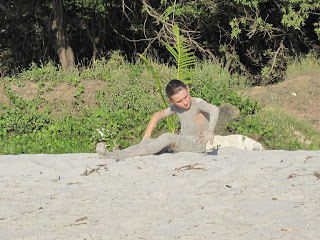 Inspired by the other boys, Wesley also coated himself in sand. Wes was the only kid that I realized (at 4:00) that I hadn't put sunblock on. Luckily I think the dirt covering him did the trick. His cheeks looked kinda rosy though, so I rubbed the sand off of them and put some sunblock - made them look nice and pink. Glad to report that after the bath at home, I was glad to see that he wasn't not fried. As seen in Wes' photo above and hte following pictures, the sun was starting to get lower in the sky - it's more orange in color and longer shadows.