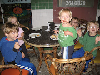 The members very nice and it was great to be at home right away even though we're a continent away from all of you. I love the Church and the gospel. The Spirit was sweet and familiar, I still don't communicate well, but they were so nice. Corey felt bad that people kept asking him if we were members - I had forgotten to pack his razor so he was not freshly shaved. I also forgot to pack clothes for him, so he didn't have a white shirt to wear. Poor Corey had to wear the same dress shirt that he had been wearing for 4 days since the MBA information session in Sao Paulo - Sorry Corey! I forgot to pack a lot of things, but we survived somehow - a family of 7 with everything packed in one big suitcase and two pack packs. Mom- talk about being minimalists, huh! Corey has a friend, Jeff, who is on a little tour of South America with his fiance Kasey - they've gone from Chile to Uruguay to Brazil - they met up with us in Camboriu and the two of them had more luggage than our family, which made me feel embarrassed and impressed by us at the same time. We had some food with them at the beach. Here are our messy kids: