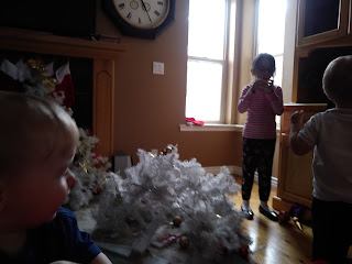 So, in my opinion, there is an annoying down side to having the Christmas tree up for a whole month. The reason is that, here at our house, it's hard to keep the ornaments on the tree with the toddlers around. Today, for example, Daniel was hitting the tree with his teddy bear...