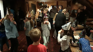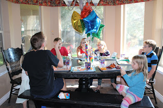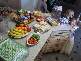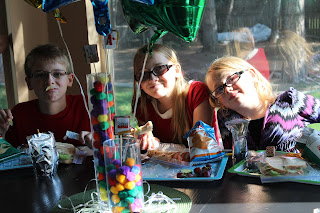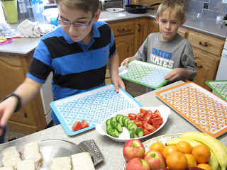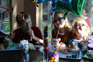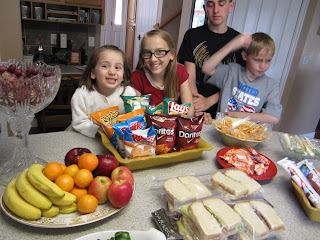 It wasn't school year's eve for all our children, but it was the new school year's eve for our family, so that meant that even the Kindergartner and Junior High crowd that starts next Monday were invited to come. First, we had a feast of ham and cheeses sandwiches, with custom ordered turkey bacon avocado sandwiches for those with refined tastes (Corey).Also on the menu were cheese puffs, Lay's chips, mango slices, and pickles.