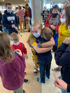 So we were a little late leaving home and giving ourselves enough time to picking up the kids from school. We parked, ran in, Corey took a left to the baggage claim with most of the kids and I went straight to the Greeting room area, where Mel was standing with my parents, Corey's parents, and Joseph. I got a hug followed by Daniel -