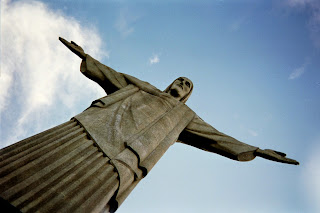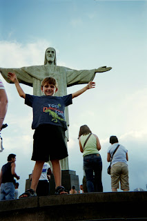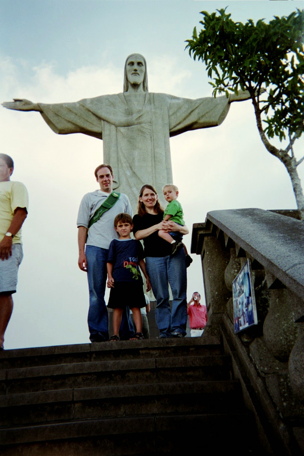The person who we thought would pick us up at the airport wasn't there so we got a taxi. Nice driver. Corey did a little small talk with him, the other 3 of us just looked out at all the cement buildings and the ocean bay and we drove to the down town area. The streets in the city are very small, many are pedestrian only, including the one that our hotel was on - there was a person at the end of the street protecting it from cars, but they removed their street cones to let our taxi pass, and the taxi drove down what seemed like a small alley with people walking up and down it and then it stopped. "We're here!" I wasn't sure we were really at a hotel, but we took his word for it, got out in what seemed like a back street alley and the fronts of all the buildings were supposed to be on the other side, but we walked over to a iron-barred gate, walked inside, and there we were in the Itajuba hotel lobby. Nothing fancy, but comfortable. We had a room with a lock, so we felt safe with a homebase and have lived to tell the tale. We decided to go find lunch, all we had to do was walk out the lobby door and there were tons of little food shops there in the street - ("alley" to me). We just started walking, Corey seemed to know where he was going, but I was lost after taking a few corners - just a big urban jungle to me. It's beautiful and busy and huge and small - the hills/mountains shooting out of the ocean and land are amazing to see - We didn't go to the beach or to the famous mountain Pao de Acucar. We wandered around for a bit trying to see if we could find the Church Employment office building where Corey was going to be teaching the GMAT class that night, but eventually gave up and then decided to find place to eat. We wandered into a three story, narrow and vertical restaurant - we climbed the stairs to the 3rd level, and ordered some food that was too complicated a process (it was some talian restaurant where you make your own lasagna and design your own salad - for each one all you had to do was pick out 8 ingredients from their list of 30+ - we didn't know what they were and had a kinda hard time ordering for ourselves, and asked Joe if we could just share a bite of ours with him and then buy him some fries at McDonald's after, so that we wouldn't have to try to figure out what to order him.) After fries and ice cream at McDonald's we got a taxi that drove us up to the Cristo Redentor statue.