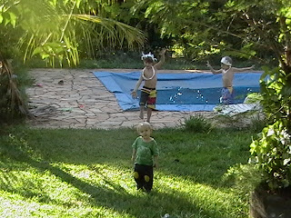 Here is a picture of Wesley saying Cheese with Joe and Ethan by the pool (see picture #5) - the pool aka "the ocean" - Joseph was the Water King I think, and Ethan was the Ice King, each wearing their paper crowns and paper necklaces. Ethan they admitted they looked more like Indians, but they didn't care. They were so funny to watch, I loved it and got some of it on tape, we'll show it to you when we get home. Love you all, see you soon! -Tiffanie