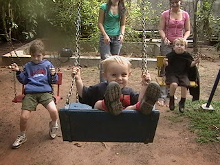 I had a fun birthday on Saturday - the big 31. The kids drew pictures for me during the morning in between their superhero play (I told them I wanted pictures of Hello Kitty, and off they went to work drawing Me and Hello Kitty having a birthday party together and making me cards in the shape of presents - they are all so crafty!) We stayed at home during the morning, and after lunch we went to Sorocaba for our first official Brazilian BBQ at the house of a MBA friend of Corey's, a girl named Daniele. Sorocaba is a town about an hour and a half south from us. The kids had lots of fun on their swing set, (notice Hyrum as "Blackness" on the right...)