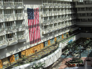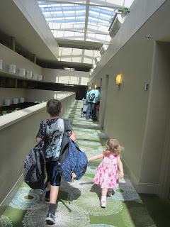 After we landed, we went though customs and that wasn't bad at all. Although it always makes me laugh to see Corey hand over a 10 pile stack of passports. "School trip?" he was asked. Nope, just our family. After going through there, Corey and the older kids went to check in our luggage for our next flight... but that wasn't until 5:30... yes, this is going to be a long layover. How will we cope? Corey was able to check in the luggage (thanks Delta!) while I stayed with little kids who made a big mess with crackers and drawing papers. And when he returned, he said "Grab your stuff, I got us a room!" What? A hotel room? Wow, brilliant! Yes, there is a Hyatt hotel right there in the Orlando airport.