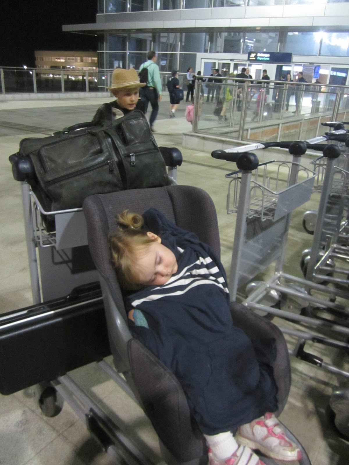 The kids kept getting drinks of water and eating their complimentary candies, and finally they were done and we got in the shuttle to head to the airport. Natalie fell asleep on the drive to the airport, so we carefully placed her in her carseat into the shuttle, then onto the smartcart - she was able to keep sleeping until we had to check her carseat.