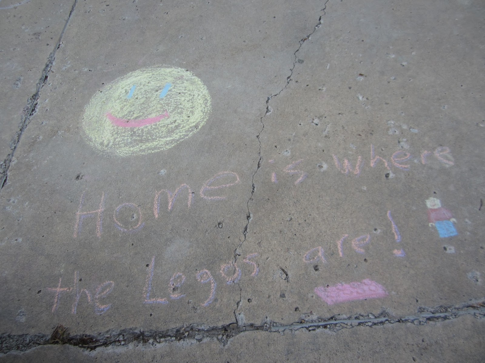 We walked in the door and after ooh-ing and aah-ing about the house and how it felt the same as before (it is the same!) they went straight for the Lego room. This chalk writing on the driveway spoke truth - "Home is where the Legos are!"